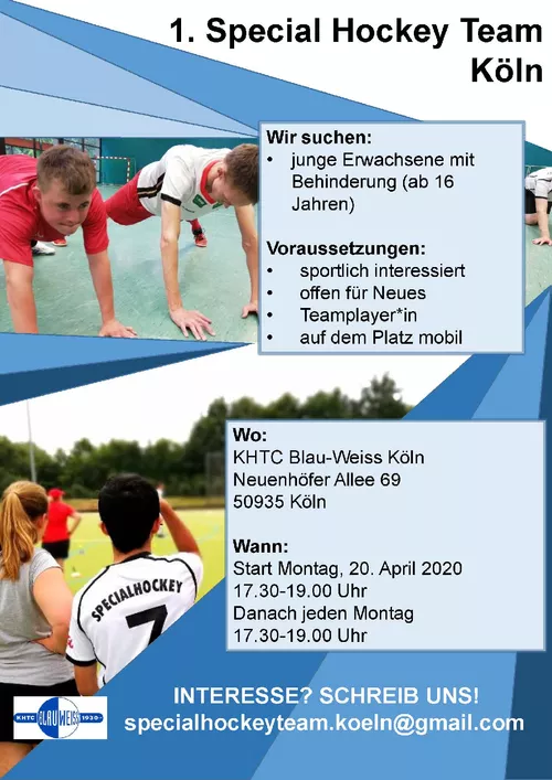Am 20. April startet das neu gegründete "1.Special Hockey Team Köln" ins Training. Interessierte junge Erwachsene ab 16 Jahren melden sich einfach bei den Verantwortlichen (specialhockeyteam.koeln@gmail.com).