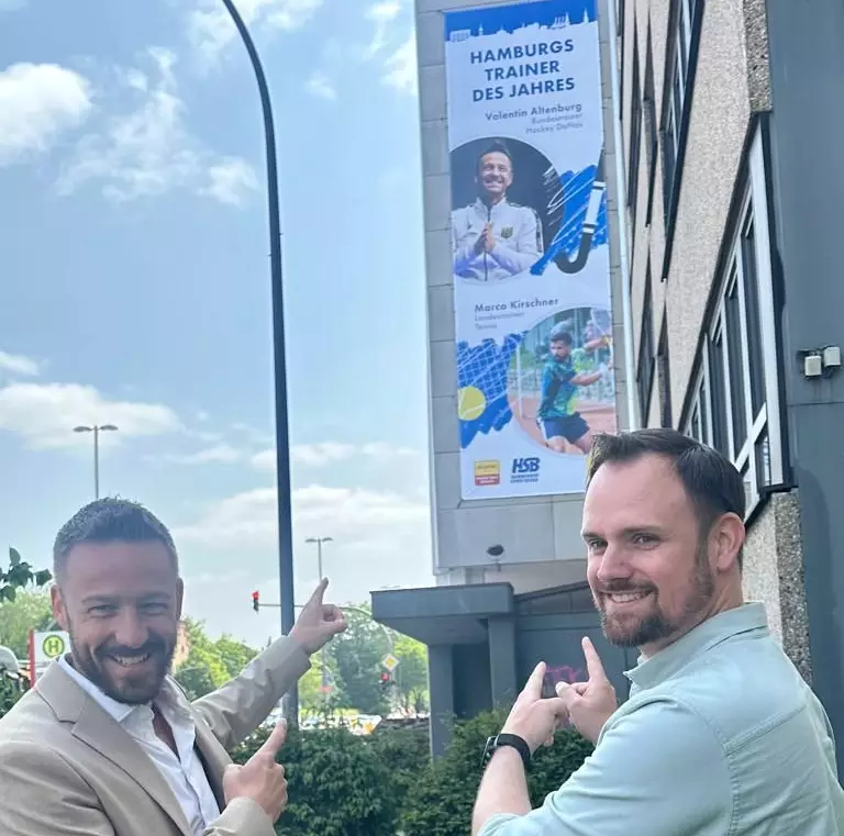 Der Hamburger Sportbund (HSB) hat Valentin Altenburg (Hockey) und Marco Kirschner (Tennis) ) als Trainer des Jahres bzw. als Trainer des Jahres im Nachwuchsleistungssport für das Jahr 2022 ausgezeichnet. Die Ehrung der beiden Trainer, die in ihrer jeweiligen Sportart die Athletinnen und Athleten auf ihrem Weg in die Spitze tagtäglich begleiten, wird anlässlich der 75Jahr-Feier des HSB am 04. Juli stattfinden. Um bis dahin die Vereine, Fachverbände und natürlich die Nominierten nicht länger auf die Folter zu spannen, wurden beide Trainer am 26. Mai 2023 überrascht und konnten ihre Auszeichnung auf dem Hauswand-Banner am Haus des Sports in Hamburg bewundern.