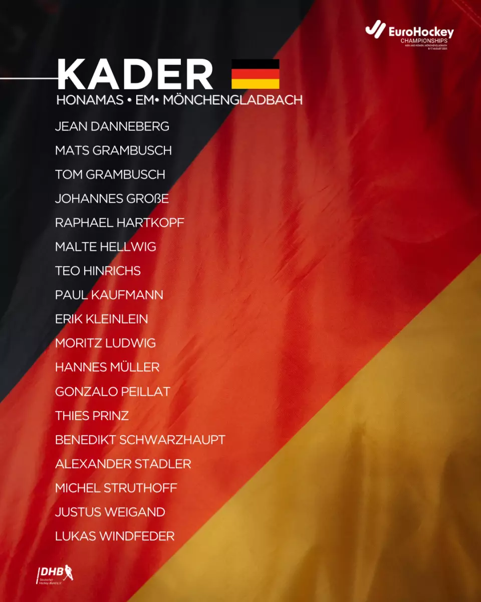 Gut vier Wochen vor Beginn der Heim-EM in Mönchengladbach hat Bundestrainer André Henning die Namen der Spieler bekannt gegeben, die für Deutschland im Hockeypark groß aufspielen sollen. Der Großteil des 18-Mann-Kaders der HONAMAS hat schon internationale Turniererfahrung: Die Torhüter Jean Danneberg und Alexander Stadler sowie die Feldspieler Gonzalo Peillat, Thies Prinz, Hannes Müller, Moritz Ludwig, Teo Hinrichs, Paul Kaufmann, Lukas Windfeder, Justus Weigand und die beiden gebürtigen Gladbacher Tom und Mats Grambusch waren sowohl beim WM-Triumph 2023, als auch bei den Olympischen Spielen 2024 in Paris dabei. Johannes Große gewann mit dem Team 2024 die Silbermedaille. Das erste Mal bei einem großen Turnier am Start sind für die HONAMAS Raphael Hartkopf, Erik Kleinlein, Benedikt Schwarzhaupt und Michel Struthoff. Stürmer Christopher Rühr wird wegen seines Studiums nicht an der EM teilnehmen können.