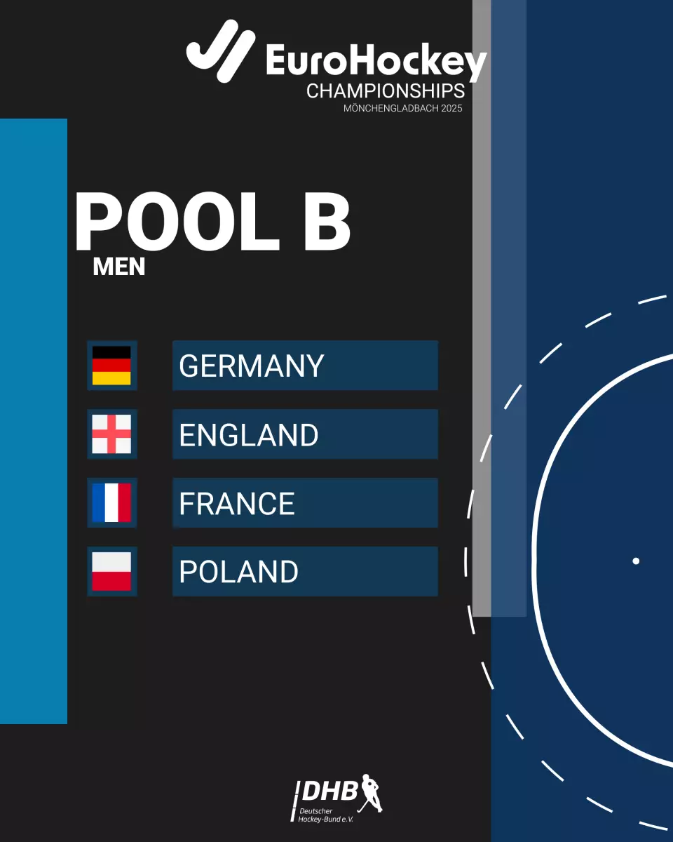 Die Gruppe B der Herren wird von Deutschland angeführt. Die Mannschaft von Bundestrainer André Henning dürfte noch eine Rechnung mit den Engländern für das verlorene EM-Halbfinale von 2023 offen haben. Im Flutlicht von Mönchengladbach setzten sich die Engländer im August 2023 im Penalty-Shootout gegen die HONAMAS durch, zogen ins Finale ein und gewannen am Ende die Silbermedaille.