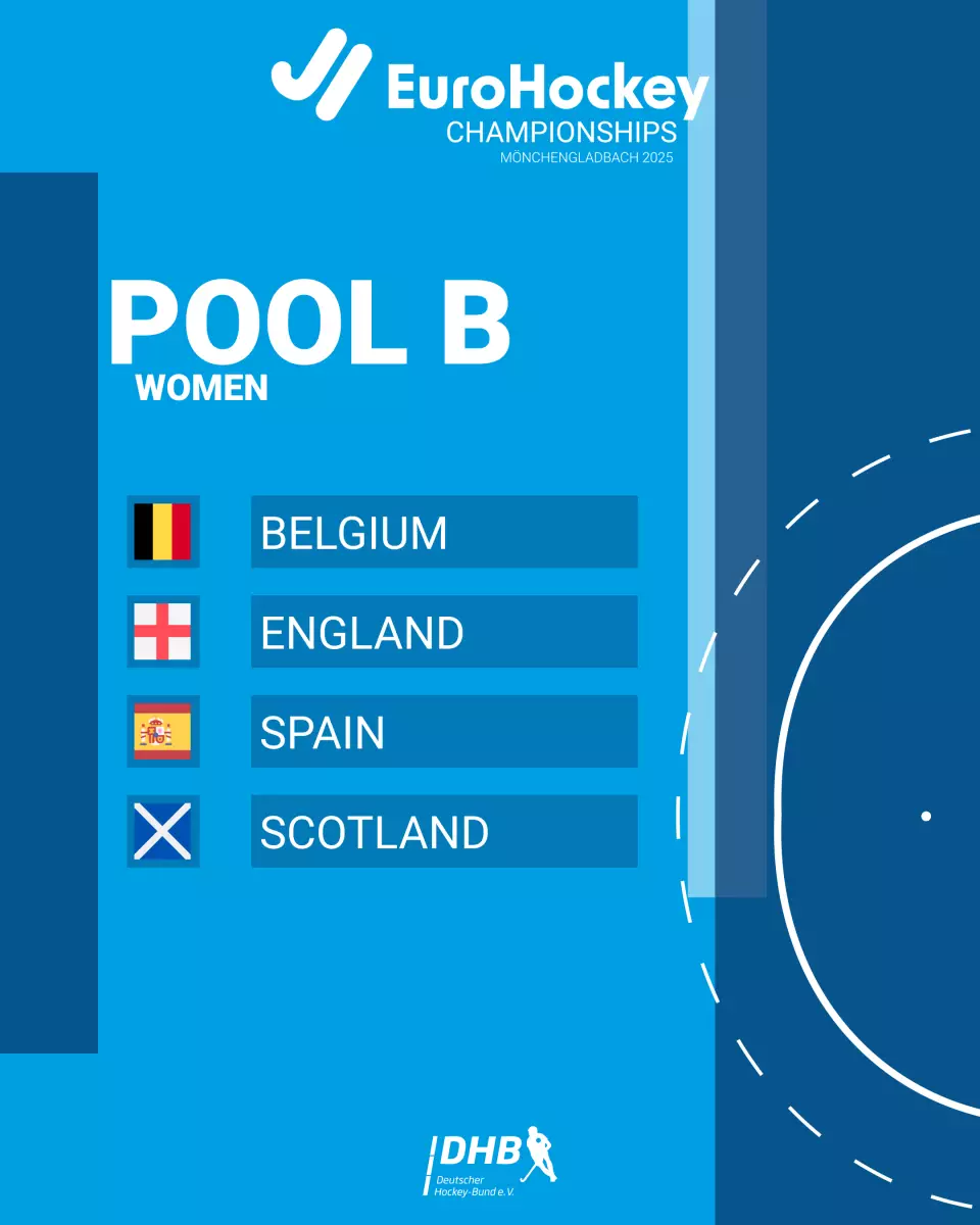 Auch die Gruppe B der Damen bei der EuroHockey Championships 2025 in Mönchengladbach hat es in sich. Der Olympia-Vierte Belgien geht als Favorit in die Gruppe. England, der Vierte der letzten Europameisterschaft 2023, wird sicherlich einen Halbfinalplatz für sich beanspruchen wollen. Aber auch die Spanierinnen, die bei den Olympischen Spielen in Paris das Viertelfinale erreichten, werden alles für eine Halbfinalteilnahme geben. Schottland wird in der Gruppe B die Rolle des Außenseiters einnehmen. Sie beendeten die EuroHockey Championships 2023 auf dem vorletzten Platz. Die Schottinnen qualifizierten sich im August durch einen Sieg im Qualifier-Turnier in Glasgow für die EM in Mönchengladbach.
