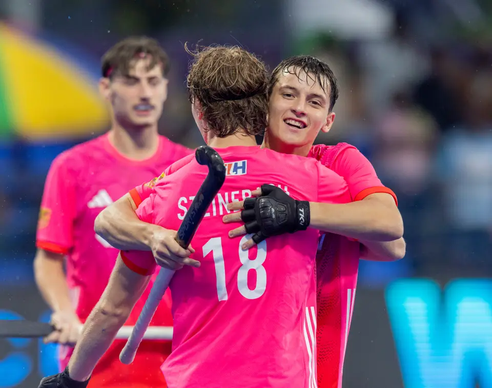 Die Eagles, gegen Kanada im pinken Outfit auf dem Platz, bespielten im eigenen Ballbesitz weiterhin die kanadische Hälfte, konnten aber noch zu selten echte Gefahr ausstrahlen. Eine starke Passkombination, bei der schließlich Titus Wex über den rechten Flügel in den Schusskreis eindrang und Ben Hasbach in der Mitte bediente, brachte dann das 2:0 in der 24. Minute. Die Kanadier konnten sich im Anschluss immer weniger aus der eigenen Hälfte befreien. Ihr hohes Pressing und den eigenen Ballbesitz konnten die Deutschen jedoch erstmal nicht in weitere Tore ummünzen.