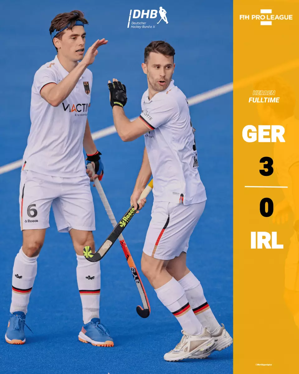 Die HONAMAS haben bei der FIH Pro League in London auch die zweite Partie gegen Irland gewonnen. Drei Tage nach dem historischen 7:0-Erfolg gelang dem Team ein souveräner 3:0-Sieg. Die Tore erzielten Timm Herzbruch (36./PS), Gonzalo Peillat (42./PC) und Thies Prinz (60.).