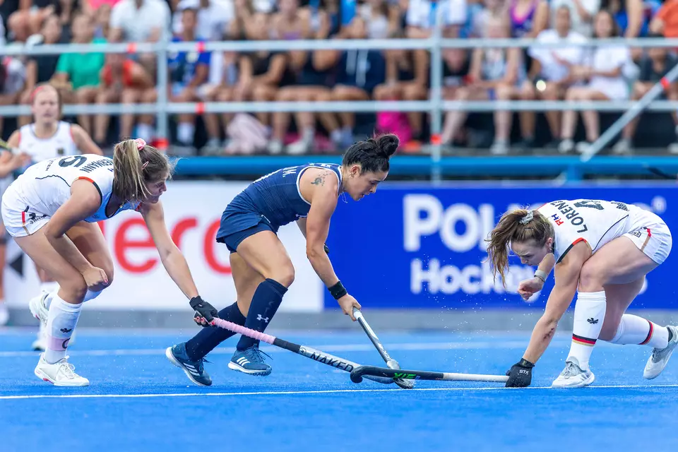Vor einer grandiosen Kulisse hatte Maria Granatto die erste gute Möglichkeit für die Argentinierinnen und Amelie Wortmann bekam eine frühe grüne Karte, sodass die Danas bereits früh in Unterzahl spielen mussten. "Las Leonas" waren von Anfang an bemüht das Geschehen zu kontrollieren und pressten sehr früh. Deutschland stand defensiv gut und lauerte immer wieder auf Umschaltmomente, aber versuchte immer wieder selbst längere Ballbesitzphasen zu haben. Der nächste Umschaltmoment brachte die Führung für die Danas: Nach der Vorlage von Lena Micheel markierte Charlotte Stapenhorst mit einem starken Abschluss den Führungstreffer. Die nächste gute Möglichkeit ließen die Danas in Person von Selin Oruz liegen. Somit ging es mit einer 1:0-Führung in das nächste Viertel.