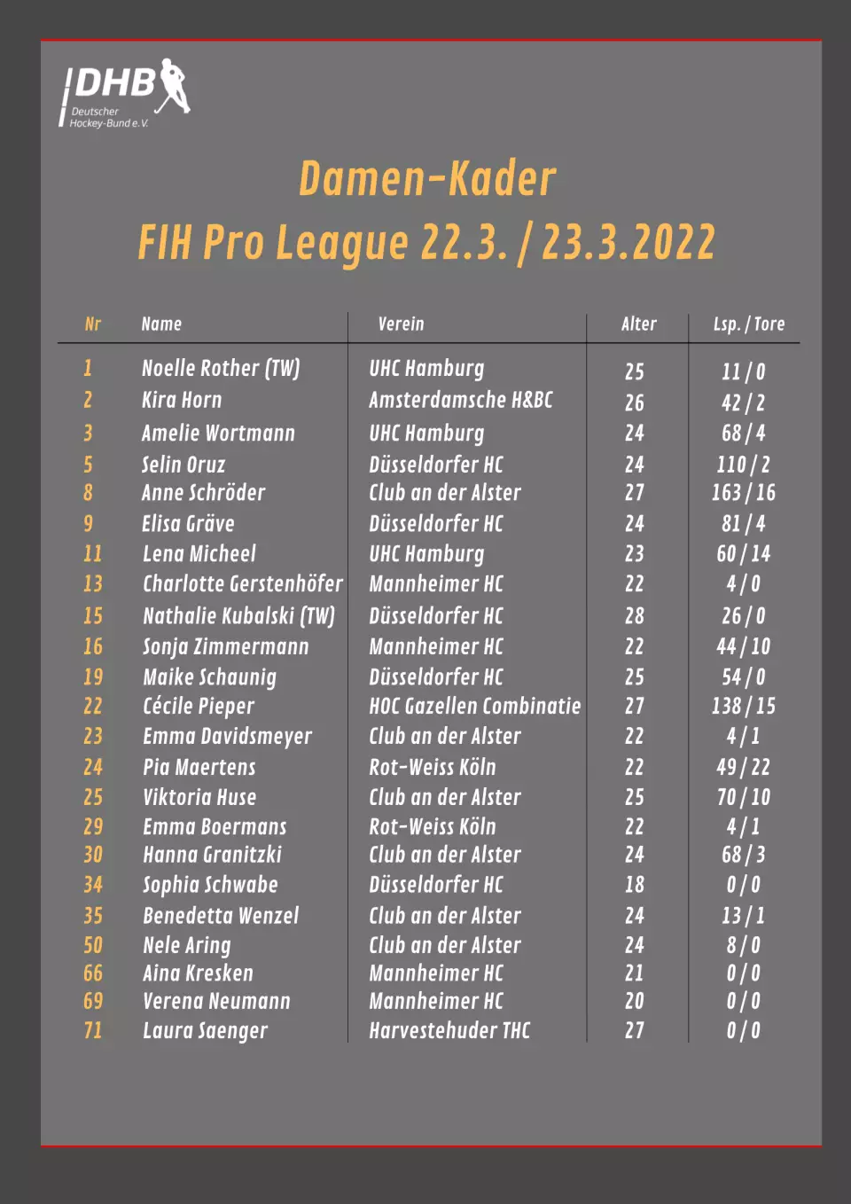 Ein großer Teil der deutschen Damen hat zu den Spielen in Düsseldorf einen kurzen Anfahrtsweg: Für Nathalie Kubalski (TW), Elisa Gräve, Selin Oruz, Sophia Schwabe und Maike Schaunig ist es nicht nur ein Heimspiel aus nationaler Sicht. Das Quintett läuft in der Bundesliga für den Düsseldorfer HC auf. Aber auch die Kölnerinnen Emma Boermans und Pia Maertens, beide Rot-Weiss Köln, haben es nicht weit. Der weitere Kader setzt sich aus Spielerinnen aus Hamburg, Mannheim sowie zwei Holland-Legionärinnen zusammen.