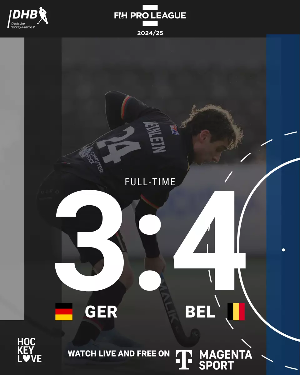 Nach 50 Sekunden im letzten Viertel holte Michel Struthoff die erste Strafecke für Deutschland heraus: Der Versuch von Gonzalo Peillat konnte jedoch verteidigt werden. Anschließend gab es weitere Strafecken für die HONAMAS. Mehrere Wiederholungsecken erhöhten den Druck und am Ende war es Martin Zwicker, der das 1:3 erzielte. In der 54. Minute hatte Belgien eine Antwort parat: Tom Boon erzielte nach einer Strafecke sein drittes Tor am heutigen Tag. Belgien bekam eine grüne Karte und Bundestrainer André Henning nahm den Torhüter raus, sodass die HONAMAS in Überzahl waren. Der Mut wurde direkt belohnt: Florian Sperling erzielte wunderschön in der 54. Minute nach überragender Vorarbeit von Erik Kleinlein das 2:4. Kurz danach kam Sperling zum Abschluss, verfehlte bei diesem Versuch allerdings das Tor. In Überzahl erspielten sich die HONAMAS mehr Chancen: In der 58. Minute konnte sich der belgische Torhüter spektakulär auszeichnen. Kurz vor Schluss gab es die nächste Strafecke und dieses Mal war Peillat erfolgreich: Er traf in der 60. Minute zum 3:4 und sorgte somit auch für den Endstand. Samstag, 07.12.,14:30 Uhr, spielt Deutschland erneut gegen die Niederlande.