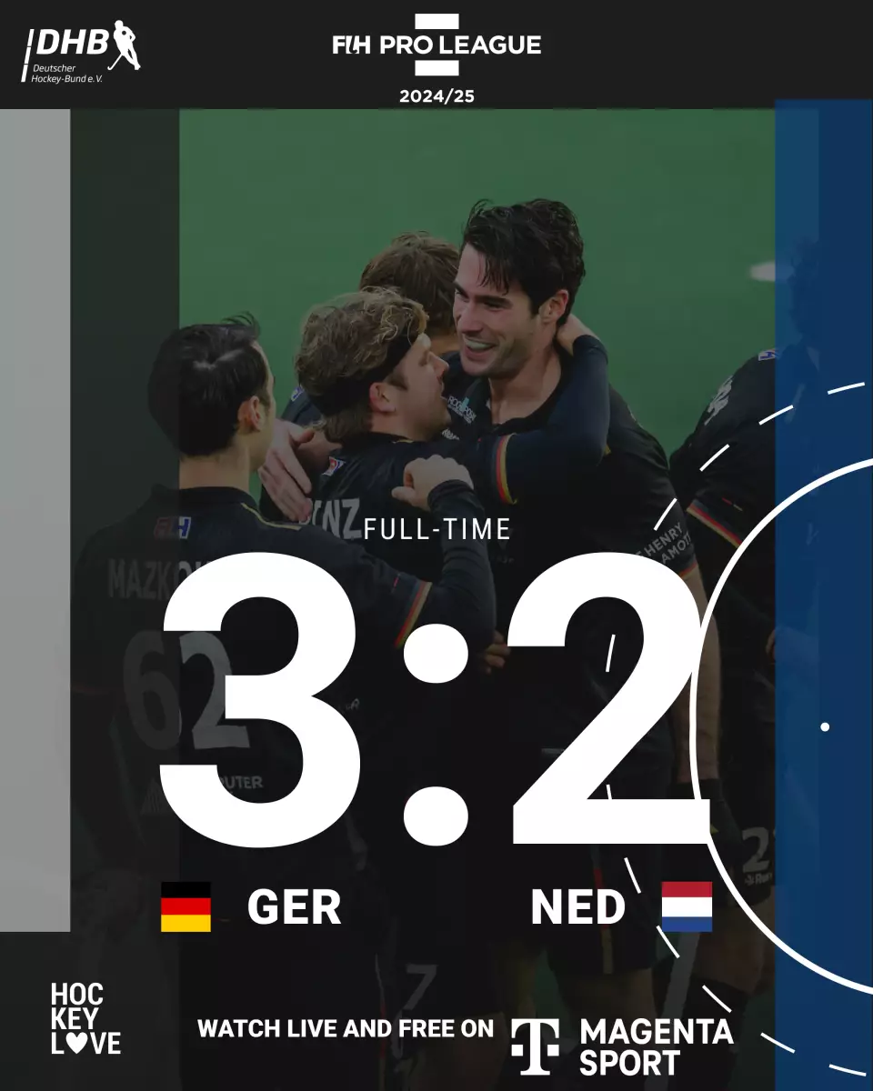 Nach zwei Minuten im vierten Viertel scheiterte Thierry Brinkman nach einem Konter erneut an Jean Danneberg. Kurz darauf gab es die große Chance auf das vierte Tor für Deutschland: Nach einem tollen Pass traf Thies Prinz den Pfosten und im Anschluss verpasste Malte Hellwig mit der Rückhand die Vorentscheidung. Knapp zwei Minuten vor Schluss traf Thierry Brinkman nach starker Vorarbeit zum 2:3. Die Gastgeber nahmen den Torhüter für die letzten 90 Sekunden aus dem Spiel, um in Überzahl zu sein. Deutschland verteidigte auch diese Situation gut und feierte am Ende einen verdienten 3:2-Sieg gegen die Niederlande.