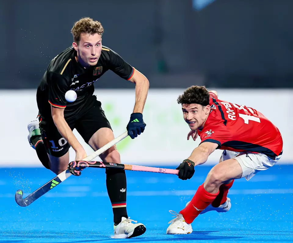 Das erste Viertel begann mit deutscher Ballkontrolle. Kreiseintritte und Torchancen konnten sich beide Teams zu Beginn der Partie nicht erspielen. Deutschland war das aktivere Team. Die erste Chance folgte zur Mitte des Viertels. Nach einem Ballgewinn von Niklas Wellen und Hereingabe von Hannes Müller sprang der Ball einem englischen Spieler an den Fuß – in der 7. Minute die erste Strafecke für Deutschland. Der Versuch von Gonzalo Peillat wurde von James Mazarelo im englischen Tor abgewehrt. Deutschland blieb in der Folge sehr ballsicher und dominant, Großbritannien sehr passiv. Die HOMAMAS versuchten immer wieder Lücken in der britischen Defensive zu finden, konnten aber keine weiteren Chancen erspielen. Torlos ging es in die Viertelpause.