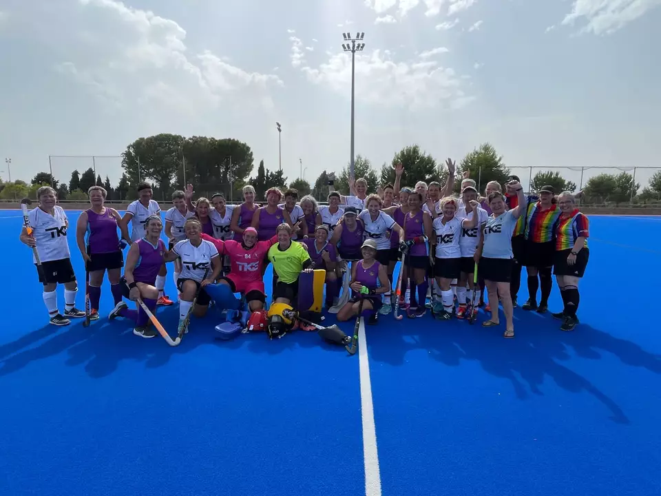Mit jedem Spiel steigert sich das Team deutlich. Nach der Niederlage gegen die Niederlande mit 0:3, waren wir im Spiel gegen den Favoriten England die Überraschung des Tages. Bereits in der 6. Minute kassieren wir einen 7m, der von England nicht verwandelt wird. In der 13.ten Minute erzielen die englischen Ladies dann das 1:0 durch wirklich schönes Eckentor. Das deutsche Team ist während der ganzen Partie ziemlich unter Druck. Im zweiten Viertel (20. Minute) erkämpft sich Bärbel den Ball und spielt einen sehenswerten Pass auf Carmen, die zum 1:1 einlocht. Die letzten beiden Viertel werden vom englischen Team dominiert – Eckenstatistik: England 8 / Deutschland 0. In der letzten Minute kassieren wir noch eine Ecke, die Wiederholungsecke in Unterzahl kann abgewehrt werden, aber 7m. Netti hält!!! Großartig. Wir werden nicht nur von unseren Fans, die W55, gefeiert, auch von den Niederländerinnen😉