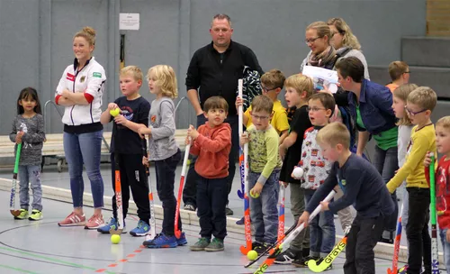 Total überwältigend war das anschließende Schnupper-Hockeytraining mit Nationalspielerin Maike Schaunig sowie den United-Trainerinnen Franziska und Julia Fleige. "Wir dachten, die Kinder sind müde vom Tanzen. Und dann werden wir förmlich überrannt", lachte Schaunig. Dribbeln, Passen und erste Torschüsse standen auf dem Trainingsprogram mit der Hockeyauswahlspielerin, die das Trikot des mehrmaligen Deutschen Meisters Uhlenhorst Mülheim trägt. Letztlich griff auch noch Simon Horn zum Hockeyschläger und versuchte, Torhüterin Julia Fleige vom Siebenmeterpunkt aus zu überwinden. Vergeblich.