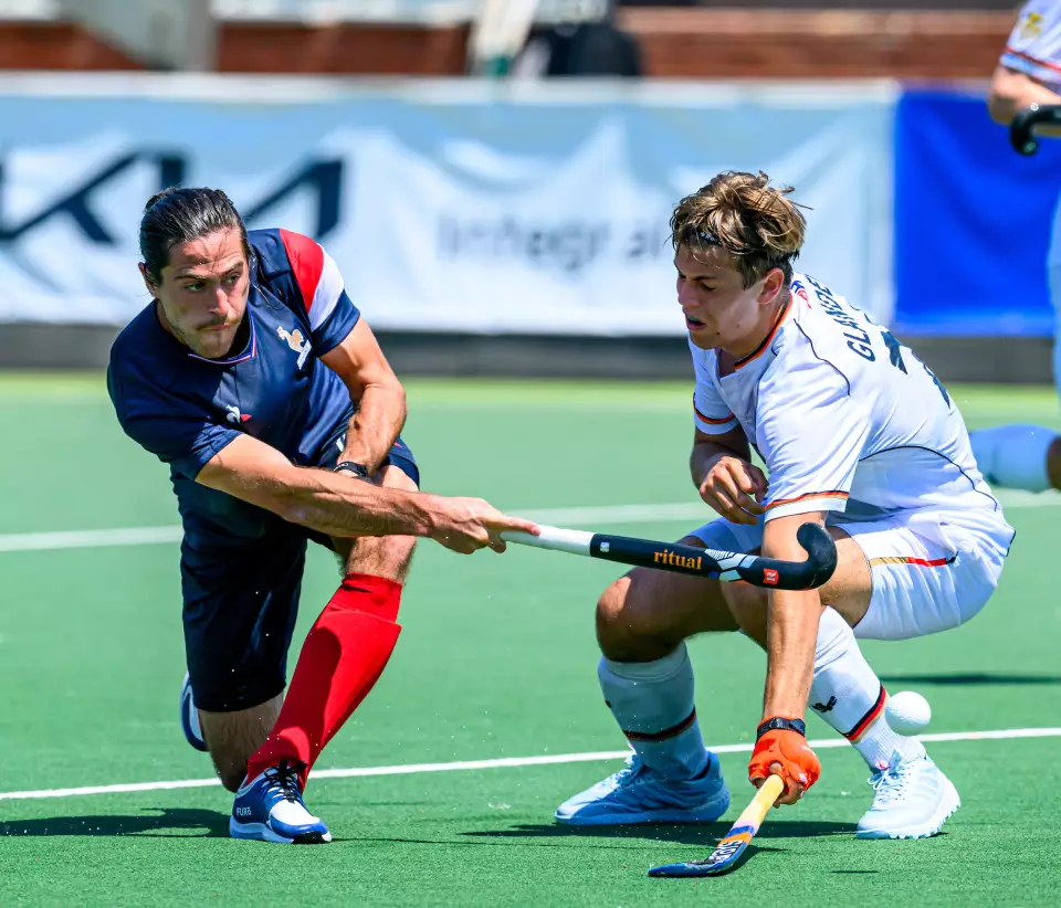 Deutschland war mit einem 3:3 gegen Belgien ins Turniergestartet, Frankreich hatte mit seinem 13:1 über Aufsteiger Türkei den wesentlich einfacheren Start. In der Neuauflage des WM-Endspiels vom Dezember 2023 (Deutschland bezwang dort Frankreich mit 2:1) starteten die Franzosen mit viel Druck auf die deutsche Abwehr, erzwang auf diese Weise auf fünf Strafecken bis zur Halbzeitpause, während das Team von Bundestrainer Rein van Eijk in der ersten Hälfte gar keine Ecke zugesprochen bekam. Das war aber auch gar nicht nötig, um zu Toren zu kommen. Ben Hasbach verwertete nach acht Minuten gleich die erste deutsche Chance zur Führung. Frankreich kam schon bald durch Tom Gaillard per Stechervariante nach der dritten Ecke zum Ausgleich (11.), doch die DHB-Auswahl holte sich die Führung noch im ersten Viertel zurück. Praktisch mit der Schlusssirene blockte Leon Lindemann den Ball nach tollem Schnellangriff zum 2:1 ins Netz.