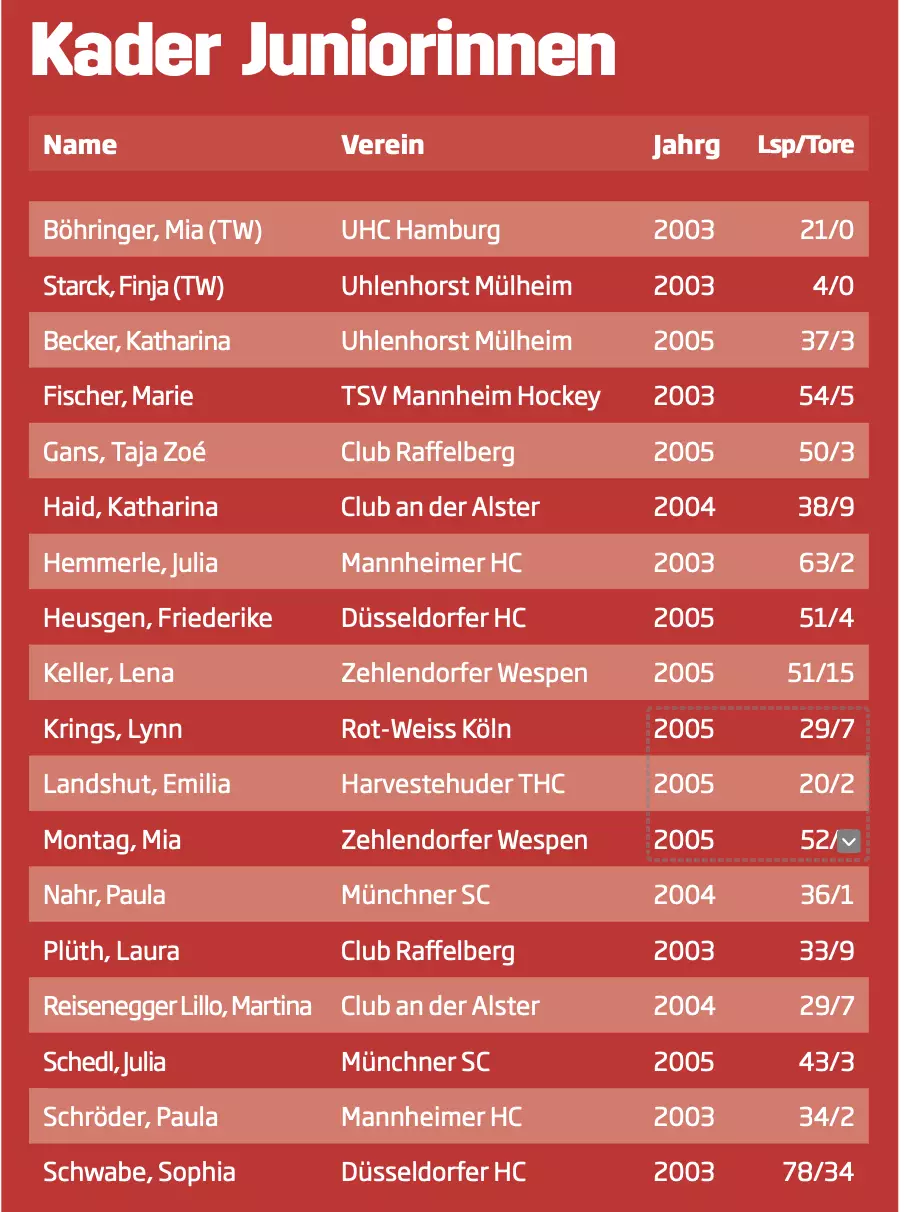 Vier Spielerinnen, die im Juli 2022 in Gent durch einen Finalsieg nach Shootout über Gastgeber Belgien zu Deutschlands neuntem EM-Titelgewinn bei den Juniorinnen beigetragen haben, sind noch dabei: Torhüterin Mia Böhringer und die Feld- spielerinnen Marie Fischer, Julia Hemmerle und Sophia Schwabe. Das Spielerinnen-Trio bestritt im Dezember 2023 auch die U21-Weltmeisterschaft, bei der Deutschland in Santiago de Chile Sechster wurde. Mit Taja Gans, Katharina Haid, Friedrike Heusgen, Mia Montag, Paula Nahr, Laura Plüth, Martina Reisenegger Lillo und Paula Schröder sind weitere acht WM-Spielerinnen im deutschen Kader für die EM in Terrassa. „In unserem Kader hat nur Torhüterin Finja Starck noch kein großes Turnier gespielt, ansonsten haben alle schon Erfahrungen bei solchen Veranstaltungen gesammelt“, sagt der Trainer, der seine Mannschaft als „guten Mix“ aus Spielerinnen der U21-Altersobergrenze (in diesem Jahr der Jahrgang 2003) und jungen Kräften („Wir haben viele junge Spielerinnen aus dem 2005-Jahrgang dabei“) bezeichnet. „Wir haben jetzt nicht unbedingt einen richtigen Superstar in unseren Reihen, das zeichnet uns aber aus, dass wir sind auf allen Positionen sehr gut und breit besetzt sind“, so Dominic Giskes.