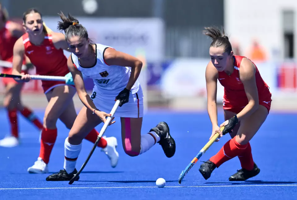 Die zweite Halbzeit begann wie die erste aufhörte. Deutschland mit schnellen Seitenwechseln und Gefahr über die Außen. England schien mit Kontern ein gutes Gegenmittel gefunden zu haben. Gleich zweimal kamen die Engländerinnen in den ersten vier Minuten des dritten Viertels zu Torchancen. Die three Lions gingen in der 39. Minute durch eine Strafecke in Führung.. Scarlett Spavin schob die Kugel unter Chiara Vischer hindurch ins deutsche Tor. Die englischen Juniorinnen blieben mutig und in der 43. Minute gab es die nächste Strafecke, die wieder sehr gefährlich wurde und eine weitere Strafecke brachte. Diese wurde abgewehrt und innerhalb von Sekunden waren die deutschen Juniorinnen vor dem Kreis der Engländerinnen. Doch wieder ohne Erfolg. In der 44. Minute folgten zwei deutsche Strafecken hintereinander, die zweite wurde von Evie Wood stark pariert und die deutschen Damen mussten in den letzten 15 Minuten einen Weg finden, den Ball endlich im Tor unterzubringen.