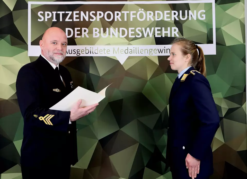 Wir treffen die Lehramtsstudentin in der Kaserne Appen in Schleswig-Holstein gemeinsam mit ihrem Vorgesetzten Oberstabsbootsmann Lutz Vollrath, dem Leiter der Sportfördergruppe Hamburg, und Oberstleutnant Jürgen Bredtmann, zuständig für die Informationsarbeit im Landeskommando Hamburg. Und es geht absolut locker zu - High Five zur Begrüßung und ein vertrautes Du, statt funktionaler Kasernenton.